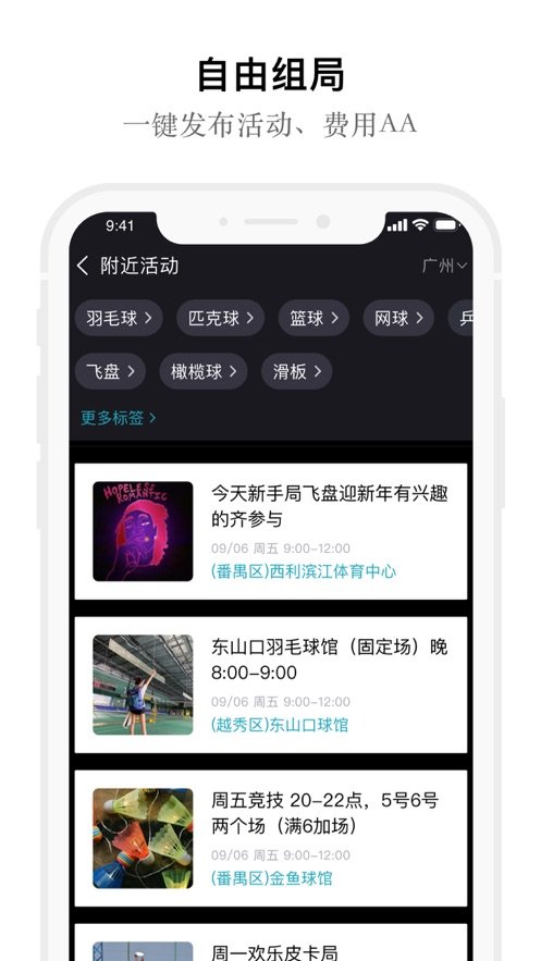 1、一键发布活动,场地费用AA。通过活动认识更多志同道合的伙伴