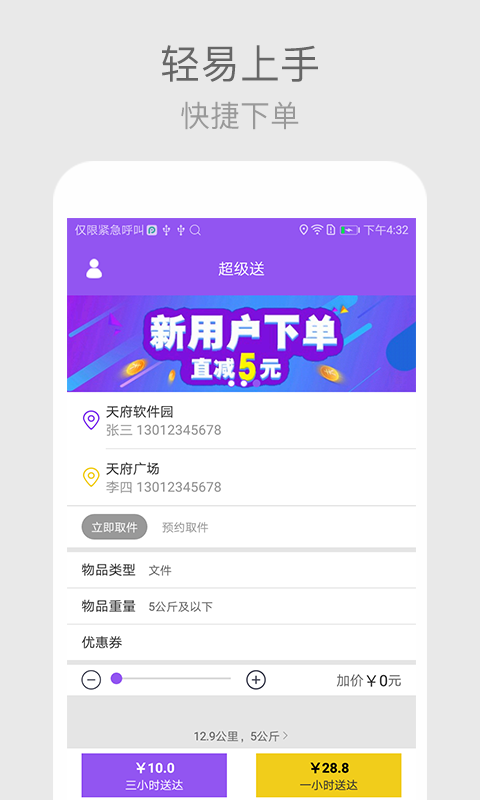 寄件神器,超级送专注于同城速递专人服务,是国内响应时间最短、取送速度最快的限时速递,为用户提供7×24小时安全送达的服务,旗下有一小时极速服务以及三小时送达,创造了中国速递服务的新模式与新纪录。