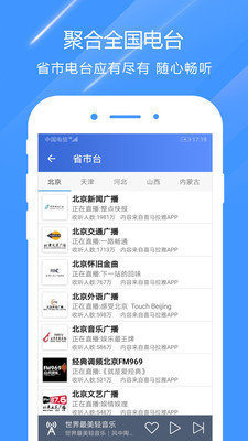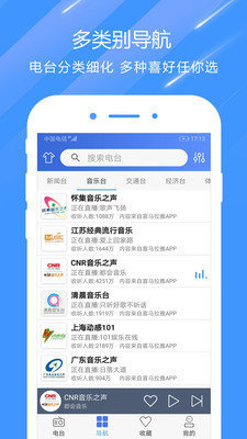 导航分类齐全,涵盖全国各省市1000+电台,还有海量音乐等资源,不受地域限制24小时不间断直播电台。