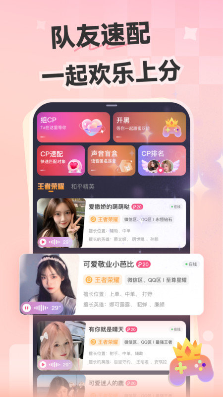 心动开黑是一款打造独特社交体验的开黑交友软件,实时匹配功能,通过智能算法推荐符合用户需求的对称用户,提高交友效率,可以进行、游戏开黑、私聊、分享文章和图片等互动方式,增加沟通乐趣,为玩家提供全方位的游戏交流和组队体验。