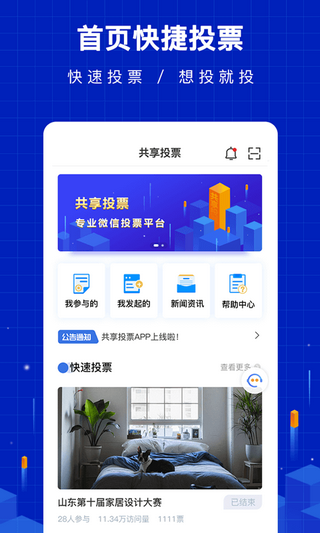 共享投票,这是一款大家都在使用的投票软件。在这里用户可以通过投票提升自己品牌的知名度,并且还可以获得曝光度,喜欢的朋友快来下载使用吧。