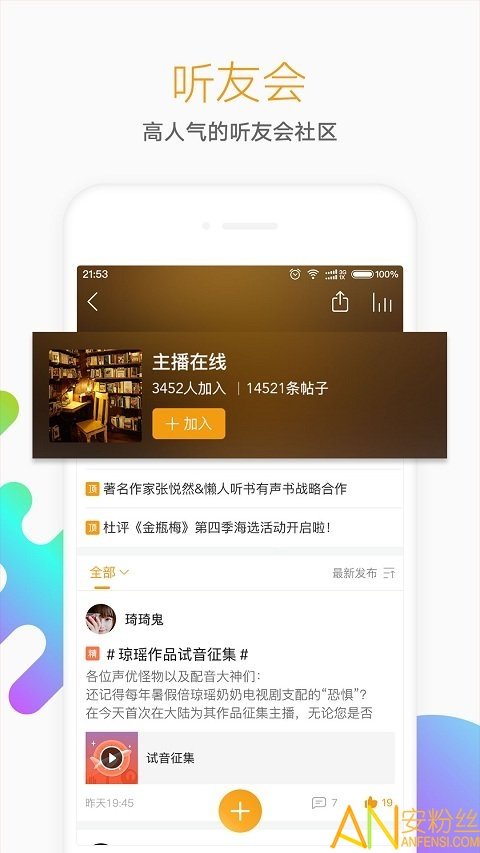 7.交流社区:可以关注感兴趣的主播和同好听友,关注后可以获得他们的收听推荐,达成即时互动交流。