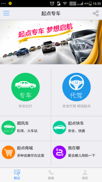 多种出行方式选择,包括专车、代驾、顺风车、快车和租车。