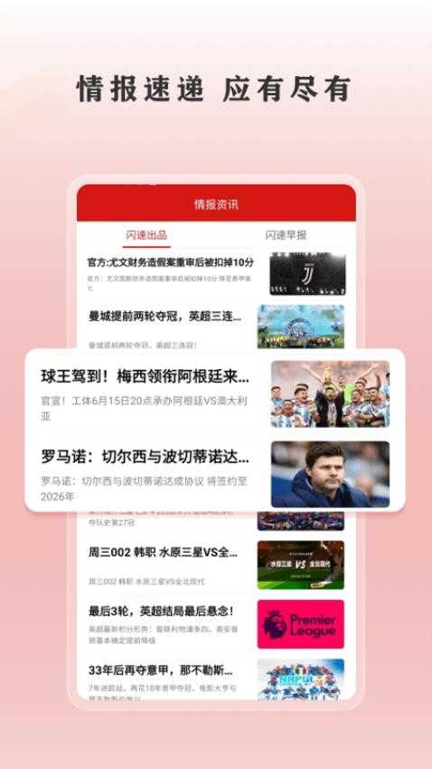 闪速是一款能够体验到全新体育资讯情报信息应用软件,内置很多精彩有趣体育视频资源内容,许多大家喜欢足球视频精彩进球时刻都可免费反复观看欣赏。