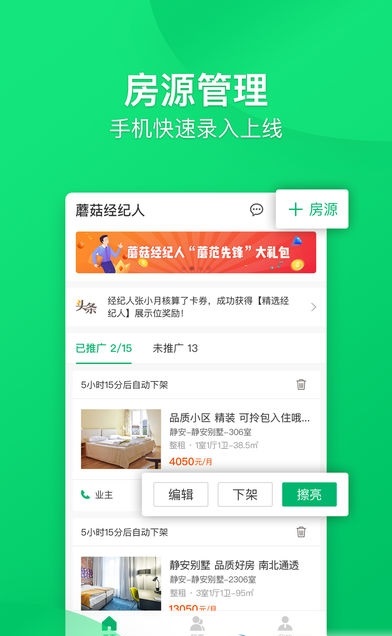 蘑菇经纪人是一款非常便捷的掌上办公类软件,方便管理房源、收集线索、移动营销等操作。软件特色为房源管理、精准线索、服务评级,亮点在于真房源、预约看房、预定房源享优先签约权、在线签约、高效便捷地对户下所有房子进行情况管理、租客信息一目了然、高效率分派团体组员工作中、公寓楼推广工具。是一款简单实用易上手的移动工作平台,帮助提升蘑菇租房经纪人的出租效率。