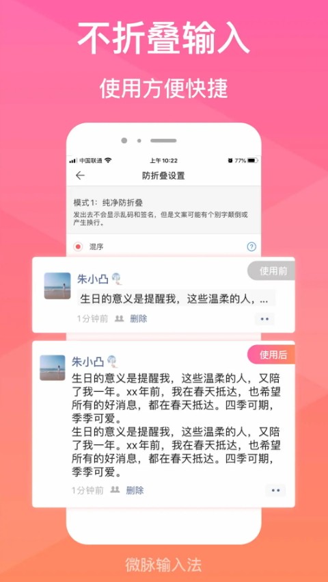 贴心网络流量优化:微脉输入法在无wifi的时候还输入时采用了网络流量优化技术,可以帮助用户节省流量。