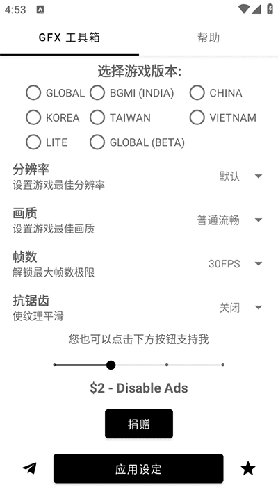 答:先在工具箱设置好如上面参数时,工具箱应用设定后进入游戏,在游戏设置里手动把工具箱没有改好的设定修改一下,如画质高清改为最流畅。