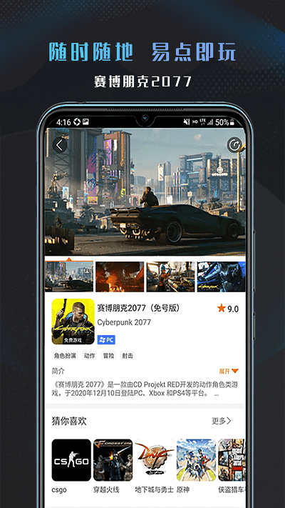 跨设备玩游戏的app,将电脑游戏在手机上运行,各种3A大作都能在手机上完美运行,无论你是喜欢网游的键盘党,还是喜欢主机大作的手柄党,易点玩云都能满足想在手机上玩的愿望。