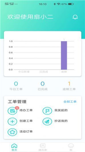 酒店工作的管理人员下载扇小二app将会得到更多服务哦大大降低信息传递带来的损耗,通过软件就可以查看各种各样的工单,另外平台上面还有通讯录功能,是您日常办公必不可少的好助手。