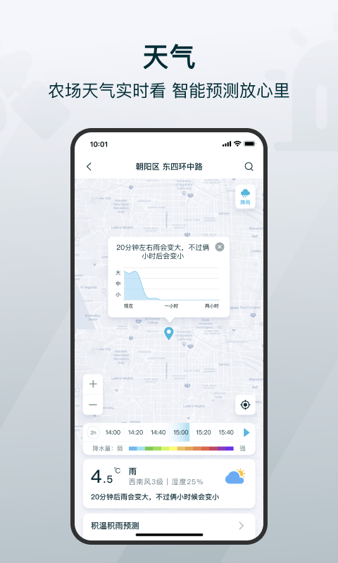 1)智能预测当地温度和降水,提供科学有效的种植决策。