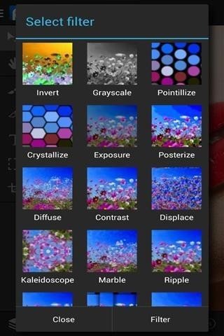 与图片的滤镜和特效 - 反转,灰度,点状,结晶,曝光,色调分离,漫射,对比度,置换,万花筒,大理石,波纹,座纺织,石油,降低噪声,提高边缘。