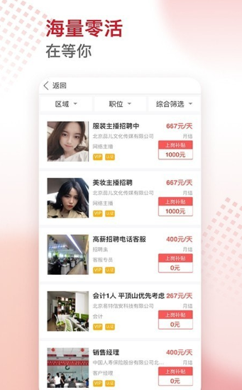 1.软件中为用户们提供了海量的工作岗位让用户们来查看应聘,各种类型的工作岗位在软件中都能找到。