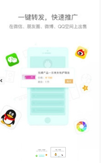 一键转发产品至、朋友圈、QQ空间、微博等平台,推广迅速。