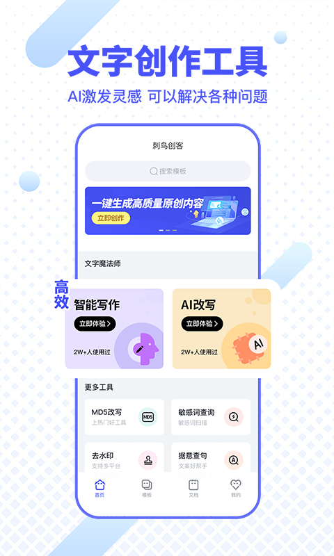 刺鸟创客是一款很好用的写作生成器软件,这里的生成工具十分的好用,软件内包含了大量优质文章的框架,句型,词汇等等,内容十分的丰富,这里可以根据不同用户的写作需求来添加,可以自由的组合,帮用户节省了许多时间,生成许多优质的内容,赶紧来下载试试吧。