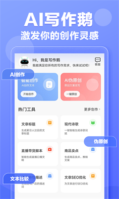 写作鹅是一款非常优质的手机在线智能写作生成服务应用软件,可以满足不同用户的需求,这里的智能写作功能十分强大,用户可以根据关键字进行生成,给用户很好的使用体验,备受用户们的青睐,非常方便且实用,十分不错,有需要的小伙伴们,快来下载体验吧!