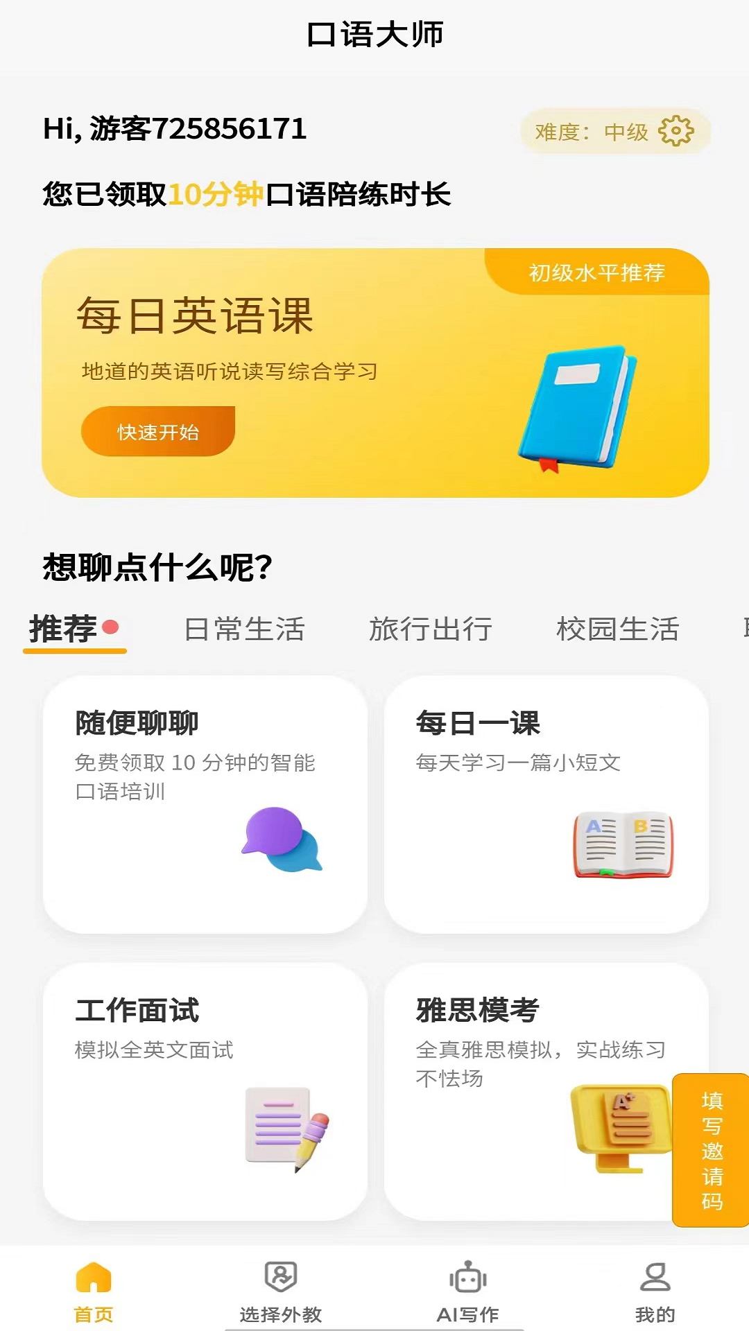 智能口语大师app是一款帮助用户提高英语口语水平的应用程序。它提供了各种各样的练习题目,包括发音、语法、词汇和流畅性方面的练习,同时还有各种各样的话题和场景,如旅游、商务和社交等。用户可以选择自己的英语水平和目标,然后通过练习来提高自己的口语表达能力。此外,该应用程序还提供语音识别和反馈功能,帮助用户纠正发音和语法错误,并提供个性化指导,以便更好地满足用户的需求。