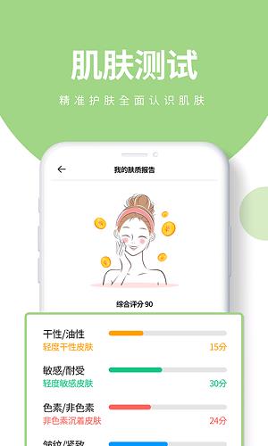2、肤质检测功能,通过在线测试,准确判断皮肤状态,个性化推荐适合的护肤方式和产品,让肌肤更健康。