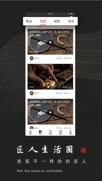 4、匠人视频发布:匠人们可以发布自己的手工艺制作视频,与其他匠人分享自己的创作灵感和技艺,激发更多人对手工艺的兴趣和热爱。