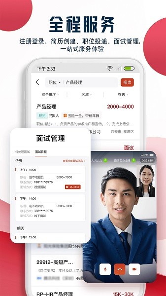 3、提供简历创建、投递、核验、推送、入职反馈和服务评价等完整的求职服务,让求职者能够一站式解决所有求职需求。