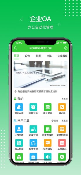 阿筑工程管理软件是一款功能强大、系统完善、适用于工程管理的app,具备全面的进销存功能,非常适合工程行业的人员使用。通过先进的云计算技术,使工程管理更高效、成本更可控,将数据作为核心,为企业提供服务。该软件适用于工程为核心业务的公司、以项目为单位的工程管理以及以劳动力为中心的人员管理。通过云考勤、移动办公、成本核算等功能,实现实时掌握劳动力状态、全局管理和动态财务报表等。在促进工程行业数据化、信息化转型方面发挥了重要作用。