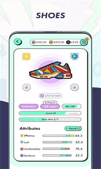 运动就可以完成任务,分为四种鞋子,步行鞋、慢跑鞋、快跑鞋、全能鞋让用户来进行对应的速度匹配,匹配到鞋子对应的速度就饿可以获得最多的收益,当然,跑的快获得的最多,让用户在锻炼自己的同时有了一个奖励的平台。