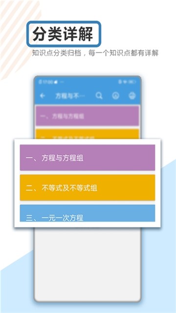 中考数学通,中考冲刺备考类软件。不同学科的知识点分类详解,专业编辑为你们归档,让你们可以借助公式定理,进行数学理科题目的套用,错题自由归纳。另内设有醒目的倒计时闹钟,可以帮助各位同学合理的去安排时间,劳逸结合,用来作为最后冲刺的提醒工具。