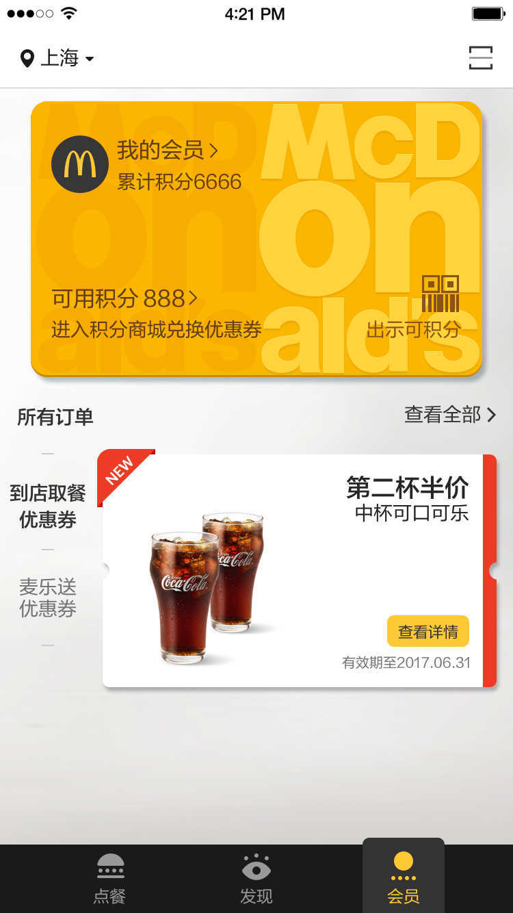 优惠:用户可以查看麦当劳的最新优惠信息,并在线下单享受优惠。