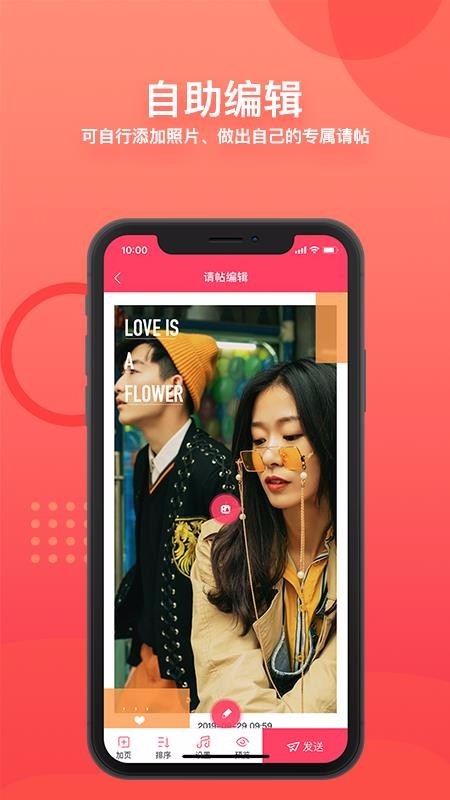 4.强大的编辑功能:用户可以添加、删除、修改、排序等操作,任意调整请帖的内容和顺序,打造个性化的电子请帖。