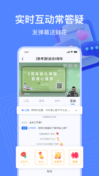 3)内置直播视频弹幕互动功能,与老师和其他学习者实时互动,增加学习的趣味性和互动性。