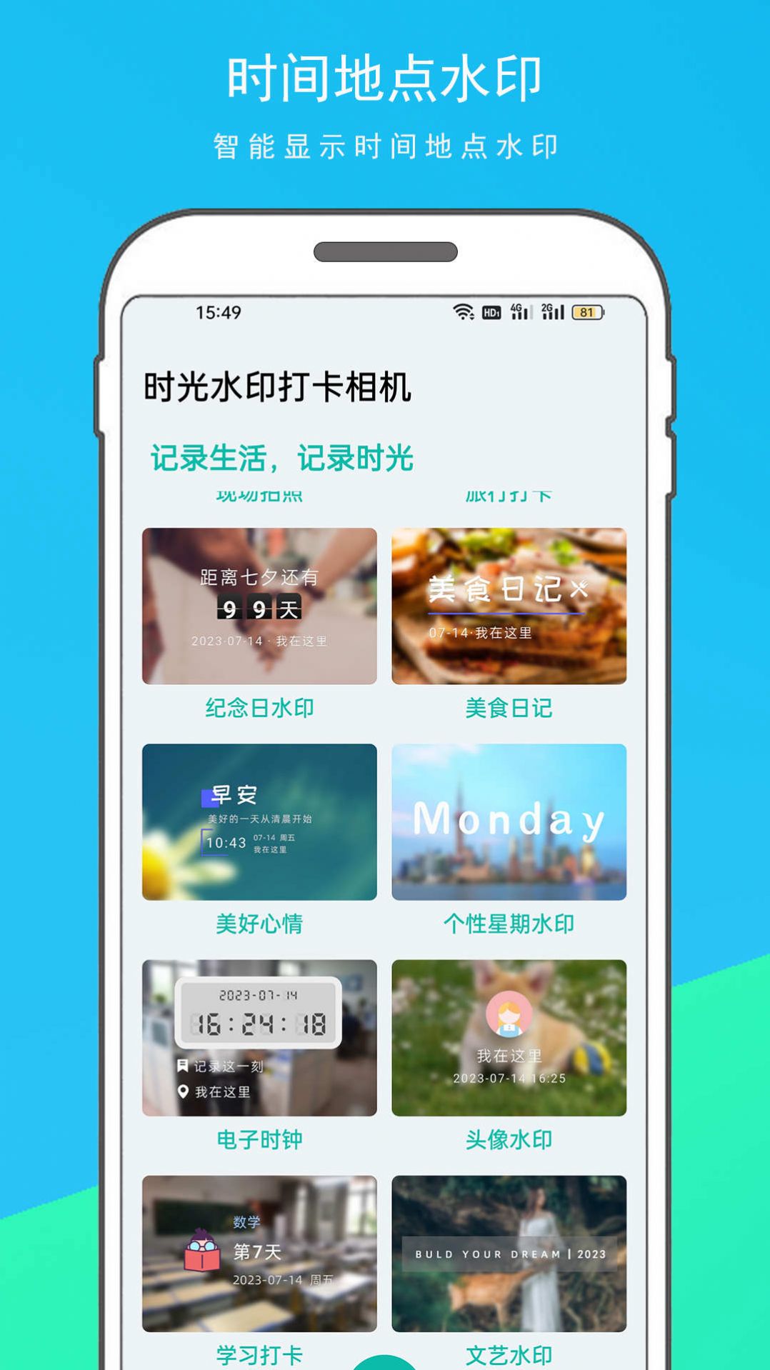 1、帮助您记录下每一个珍贵时刻,同时添加特别的水印和打卡功能,让您的相片更加生动、独特;