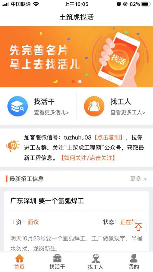 土筑虎找活是一款专门为建筑工地招工设计的找工作软件,为工友们提供方便靠谱的找工作平台,实时更新招聘信息,提供在线交流学习的功能,解决了工人和企业的招工难、用工荒问题,轻松找到适合自己的工作。