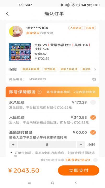 3、对于交易成功的账号提供了7天的保障服务,用户可以在生成订单后进一步确认购买意向。