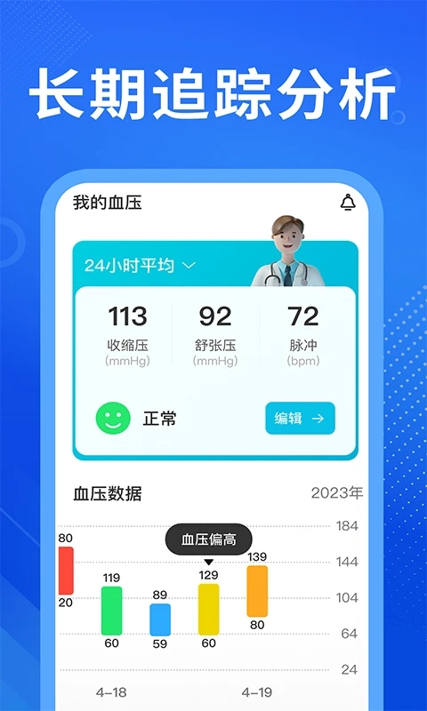 *清晰明了的数据归纳和查看功能:提供清晰明了的数据归纳和查看功能,直观地查看血压数据的变化情况,更好地了解自己的健康状况。