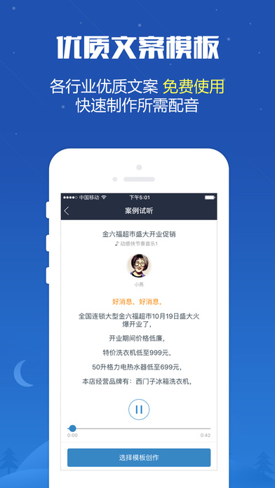 3、文案丰富:海量样音模板文案、优质背景音库,完美搭配;