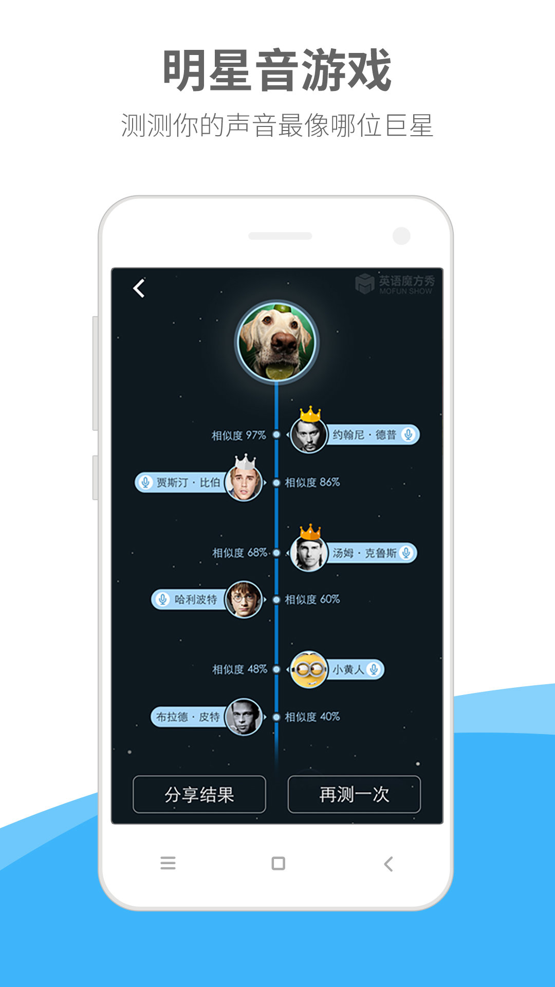 2、【明星音游戏】测一下你的声音像哪位巨星,然后去为TA配音;