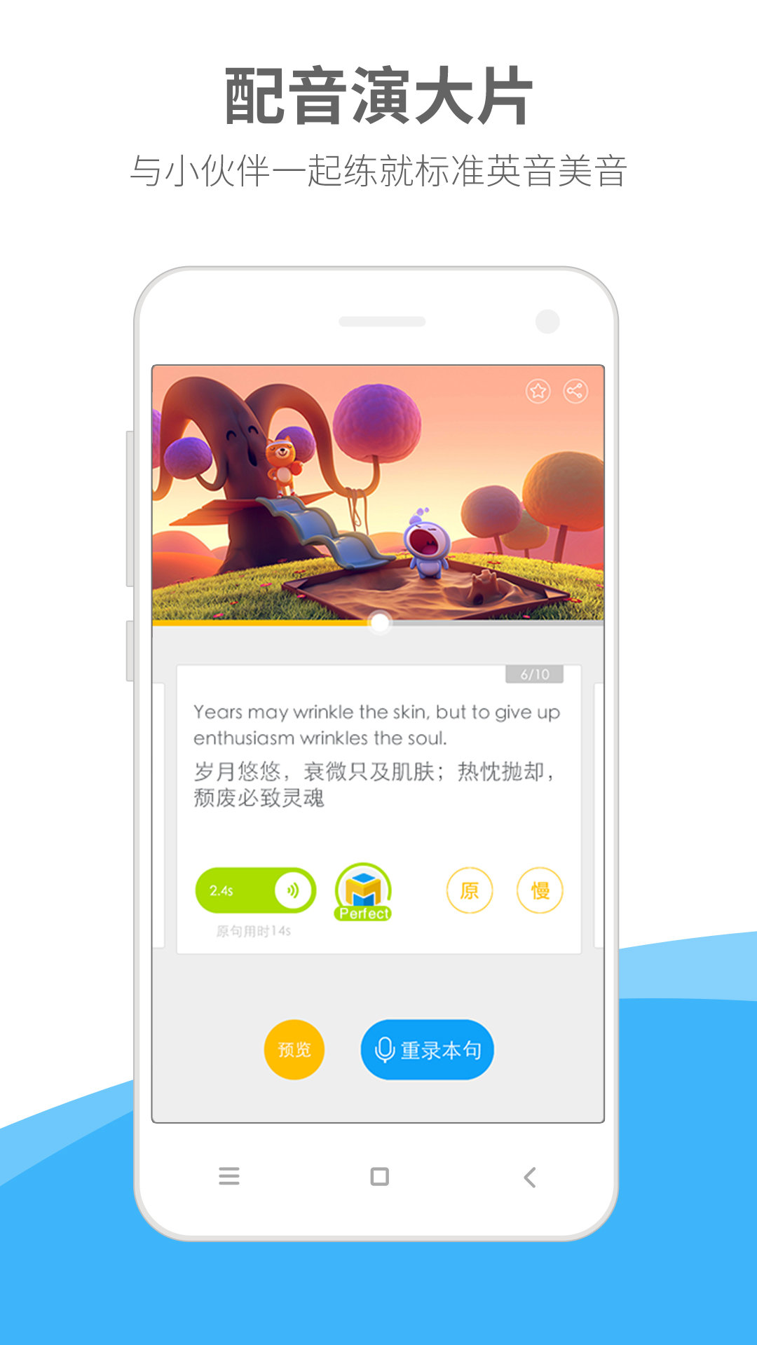 开口练英语太难?如果你喜欢这段视频,那就从跟读模仿开始,一句一句,开口练习吧。分句完成配音作品;字幕查词,即点即译;慢速播放,不放过每个发音细节,边配边学;还有即时反馈的权威口语测评系统,帮你准确定位发音问题;