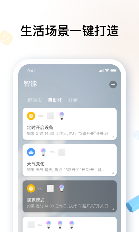3)智能联动引擎能够将不同的智能设备连接起来,实现智能化的自动化控制,用户可以一键实现整个家庭的设备的联动控制。
