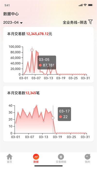2、每月交易量以图表的形式展示,让用户一目了然地看到最新的运营数据。