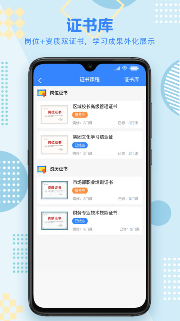 4.证书库:提供完善的证书库,通过学习并通过相应的考试,获得认证证书,增加自身的学术和职业价值。
