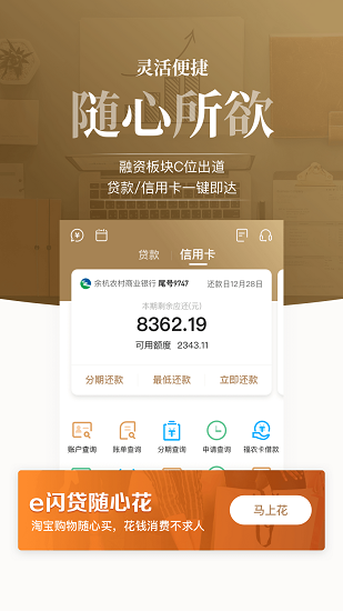 2、提供多种丰富的金融服务项目,您可以看到、信用卡、随心花、理财、存款等各种项目的图标;