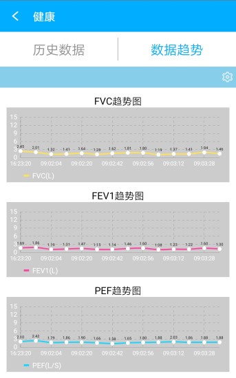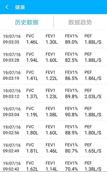 *趋势报告:通过长时间的测量数据积累,可以生成用户的肺功能趋势报告,帮助用户了解肺功能的变化趋势。