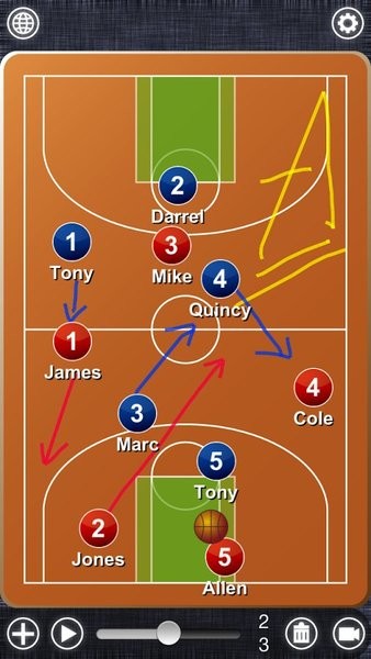 2、是一款非常好用、方便的软件,可以在手机上模拟篮球场,用手指在屏幕上做标记来说明战术。