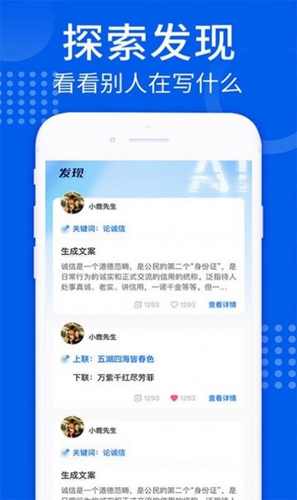 智能AI写作是一款手机写作工具,直接点击就能开始创作,根据您的各种要求,高效地解决您的要求,既方便又快速,将内心的想法全都表现出来,会有独特的体验,轻松完成写作,有需要的,可以来试试。