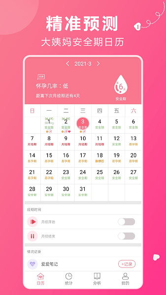 1、经期记录与预测:可以准确记录经期时间、流量和症状,能预测出安全期和排卵期,帮助女性了解自己的生理周期。