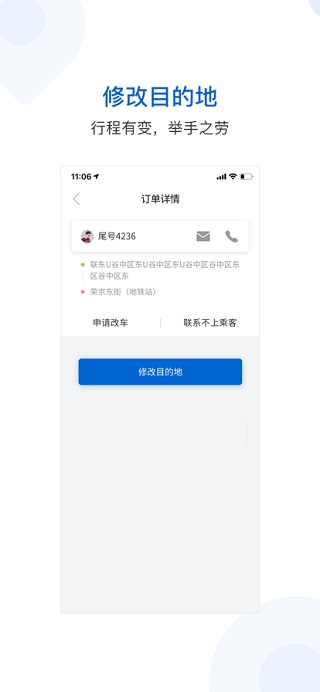 3、灵活的订单处理工具,为用户提供申请换车、修改目的地、无法联系乘客等灵活的订单处理工具。