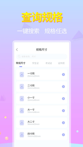 3、提供丰富的证件照规格,收集了近500种尺寸规格供用户选择,确保满足不同国家和地区的证件照要求。