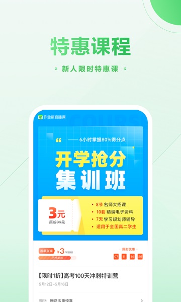 2、【优惠课程】:优质短期培训课程,新生专享福利,限时3元。一线资深名师直播授课,攻克常规考试难点;注册即可享受3年海量学习资料和无限次课程重播;