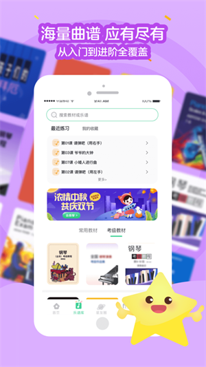 2、海量曲库,多种练习模式自由切换,从初学者到考级均适用:曲库涵盖汤普森系列到考级10级曲目,保证钢琴孩子的学习和练习进度。您可以自由选择钢琴练习模式,从读谱到弹奏伴奏。