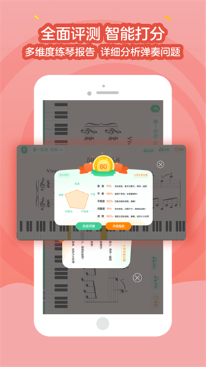 1、多维度评价,一键生成练琴报告:全曲评价模式,详细分析演奏问题,更高效有针对性的练习。主课家长和老师可以同步了解琴童的日常练习情况,实现有效沟通。