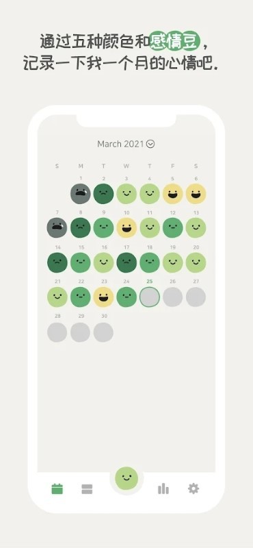 2、通过五种颜色和表情豆确认我一个月的心情。点击豆子后,您可以立即确认当天记录的内容。